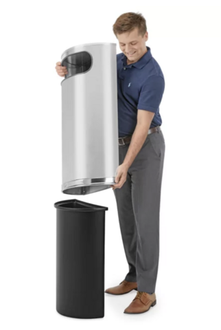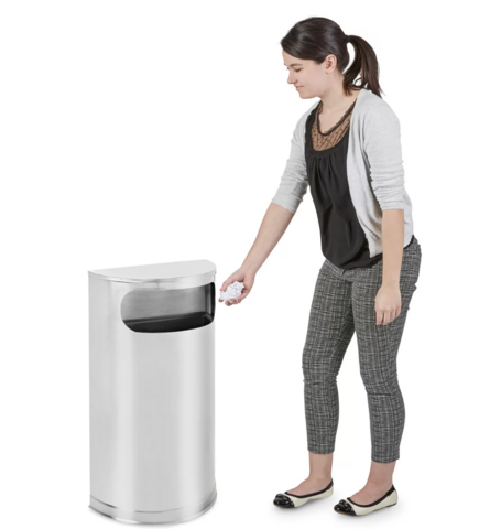 ~~Half-round shape - Fits snug against wall. ~~Fire-safe steel construction. ~~Includes leak-proof hard plastic liner. |